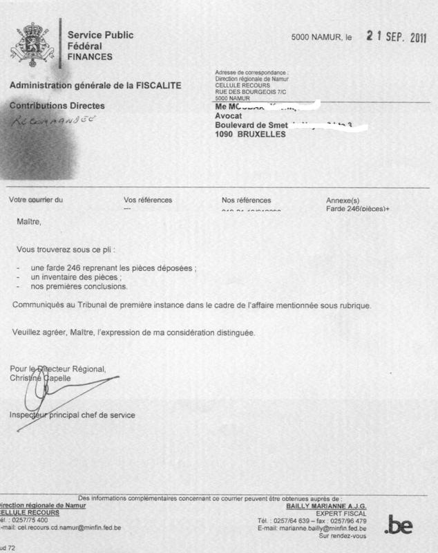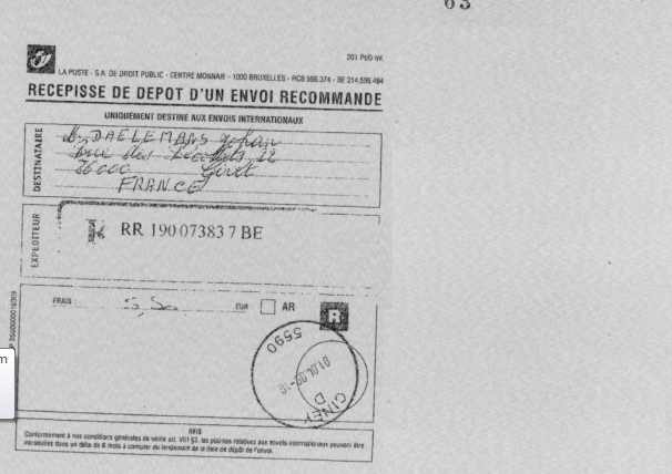 waar het eigenlijk 08600 moet zijn (Givet). Je ziet, ze kunnen bij de fiscus in Wallonië zelfs geen adres correct overnemen. Toch even onder de aandacht brengen... Het bewijs van aangetekende zending naar mijn vrouw ontbreekt in het dossier. (zie gepost vonnis) Merkwaardig genoeg vinden we wel de 'melding van aanlag van ambtswege' naar mijn vrouw terug in het dossier dat aan de rechter wordt voorgelegd. De bewijzen zijn aanwezig dat deze melding er is bijgevoegd door de fiscus einde september 2011 tijdens het opstelling van de eerste conclusies - rechtbank eerste aanleg. Het is niet de enige manipulatie van het dossier dat door ons is vastgesteld. Er zij op dat ogenblik meerdere eerder ontbrekende stukken bijgevoegd en meerdere documenten uit het dossier gehaald.