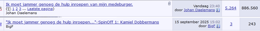 ViveLaBelgique : 4 posts Maddox: 3 posts Iamborg: 3 posts BigF: 3 posts Karel Martel: 2 posts Dus, wat is er mis met een reactie en een aansluitend antwoord? Lijkt me een normale conversatie. Bon, drie van de vijf posters brengen niks inhoudelijks en hebben last van document blindheid. Nergens van hen een reactie op gepost belastend materiaal van de fiscus. Zegt toch iets hé? Dat er na een fikse sneeuwstorm documenten worden afgeborsteld en terug in deze draad hun terechte plaats krijgen lijkt me ook normaal.