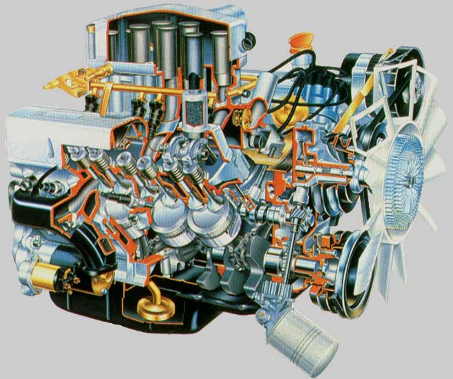 ![]() Volgens mij is er een V6 afgebeeld, met 2 kleppen per cilinder. Benzine, ik zie nml ook een bobine, bougiekabels en bougies. In elke cilinder zit uiteraard een zuiger met zuigerveren. Onderaan zie ik het oliekarter, rechtsonder oliefilter, rechts een koelventilator, daarachter een v-riem die de dynamo aandrijft bovenaan de olievuldop, bovenop met die pijpjes twijfel ik, maar het zal denk ik met de brandstofinspuiting te maken hebben, ik zie nog een brandstoffijnfilter en links onderaan het begin van de uitlaat. Zal wel uitlaatbocht heten. Tenslotte zie ik onder het kleppendeksel dat de kleppen via klepstoters worden bediend door een centrale onderliggende nokkenas. |