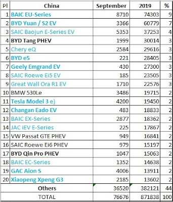 **Pogingen om die 200k grens hoger te zetten mislukten. Er zijn wel enkele staten die er ietsie bijdoen. Tesla heeft vanaf januari 2020 zelfs helemaal geen premie meer, zie tabel en legende onderaan. ##Terwijl (buitenlandse) merken er nog dik van kunnen profiteren. GM met zijn Bolt en phev ziet het ook al aan zijn omzet. ** https://edition.cnn.com/2019/06/28/b...oss/index.html ## ![]() https://insideevs.com/news/373621/fe...ecreased-1875/ Soit Tesla verkoopt zijn wagens steeds meer wereldwijd, het model 3 werd pas vanaf 2019 buiten Noord-Amerika verkocht. Vanaf 2020 zal GF3 Shanghai voornamelijk de Aziatische markt doen. Alhoewel ze nog ~ 19.450 model 3 op 9 maanden in China verkocht hebben, waarvan 4.200 in september, want door de zwakke munt Yuan, heeft Tesla de prijzen moeten verhogen, nog een reden te meer voor de Chinezen nog x-maanden langer te wachten: Citaat: