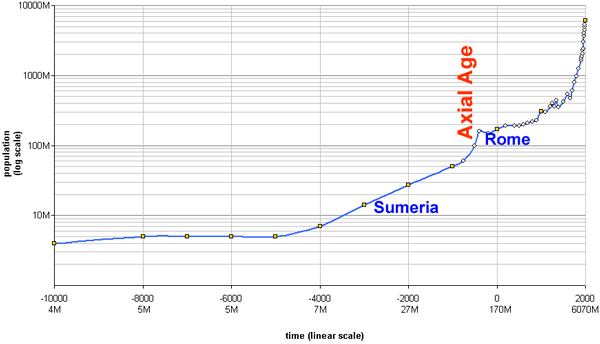 Rond die tijd begon de menselijke soort op verschillende plaatsen op de planeet tegelijk aan landbouw te doen, bijvoorbeeld aan de oevers van de Nijl ( ![]() (fig.: verticale schaal = log-schaal) |