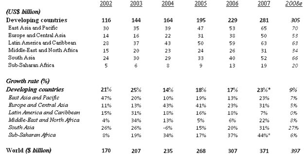 Remittances noemt men dat. Voor een aantal landen een heel belangrijke bron van inkomsten. Ook die geldstroom zal met de huidige crisis een serieuze knauw krijgen, vermoedelijk. Voor de tabellen van hieronder, zie: remittance-flows-to-developing-countries