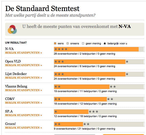 Ik krijg 4 partijen (CD&V, openVLD, NVA en LDD) die op 1 stem na gelijk staan met 16/17 overeenkomsten. Dat duidt er eigenlijk op dat geen enkele partij echt mijn standpunten verdedigt. M.a.w. elke keuze die ik maak zal er toe leiden dat standpunten verdedigd worden waar ik totaal niet achter sta.