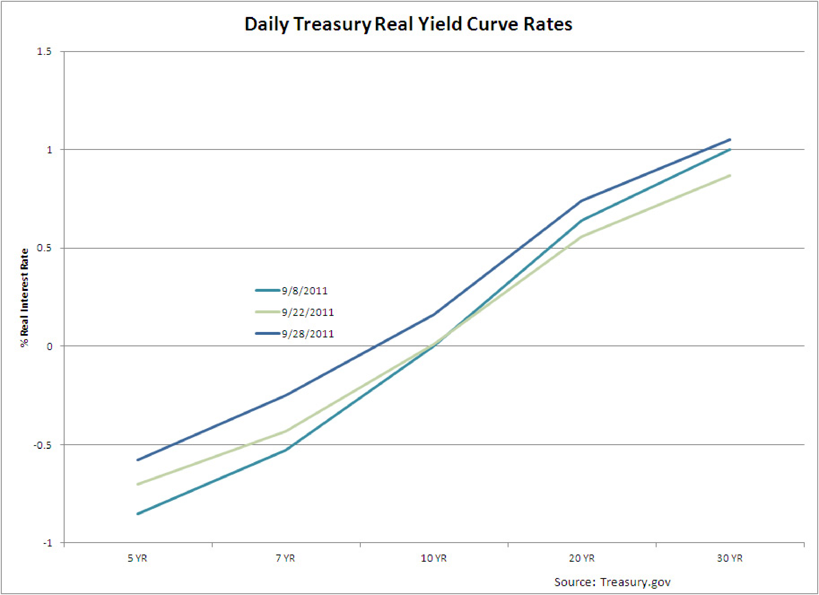 Wat je dan bekomt is de reële rentecurve. Kijk hoe deze curve lichtjes beweegt van 8 sep naar 22 sep 2011. (fig.: reële rentecurve op amerikaans schatkistpapier looptijd 5 jaar - 30 jaar, rekening houden met de officiëel geraporteerde cijfers over inflatie, bron)