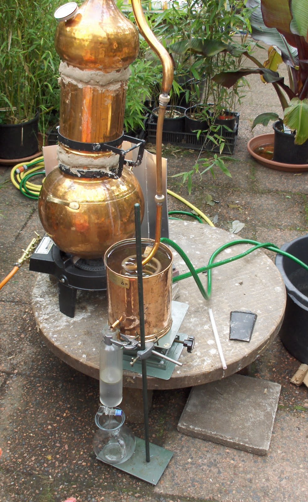 Een kruising tussen een alambiek, een hoop laboglas en een smeedijzeren structuur.