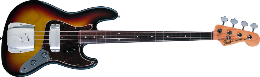 Er is evenwel een reden waarom de meeste geschoolde basspelers niet kiezen voor dergelijke (of een andere) short scale (30’’) basgitaar : de long scale (meestal 34’’) basgitaren zijn preciezer, presteren beter in de productie van diepere basklanken, en klinken derhalve beter. Hoewel andermaal : smaken verschillen. Eén der meest verspreide long scale basgitaren : de Fender Jazz Bass (hier het ’62 Vintage model, met de typische chrome pickup covers, waaronder de « ashtray ») : |