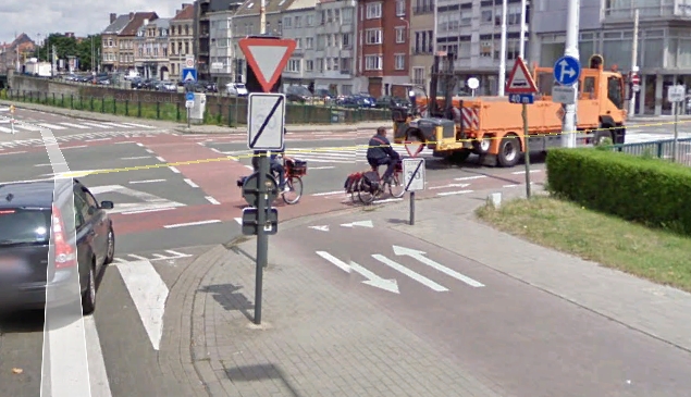 Kijk een zone 30 die niet geldig is voor het afgezonderde fietspad aan de rechterkant...(F4a links van fietspad) Het einde van deze weg roept meer vraagtekens op... Einde van de zone 30 (F4b) voor automobilisten is duidelijk. Zoals reeds gezegd, dit einde zone 30 bord is niet geldig voor fietsers, vandaar dat er een F4b staat rechts van het fietspad (jawel !). Overigens staat er aan de omgekeerde rijrichting hier wel een zone 30 bord (F4a), uitsluitend voor het fietspad. Blijkbaar kent stad Gent haar eigen regels niet goed en had vergeten een F4a te plaatsen op de locatie van de eerste foto... |