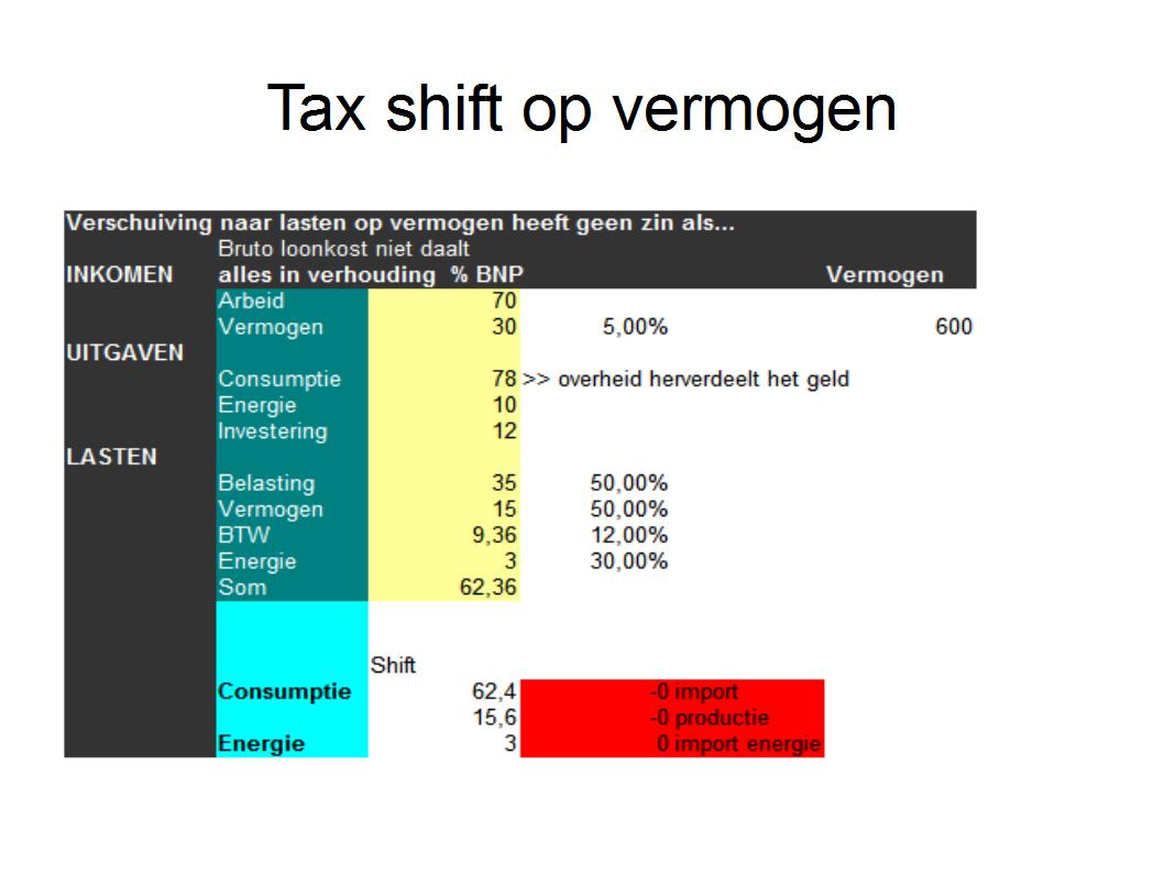 t'is doodeenvoudig Een land heeft 600% van zijn BNP (dat is de som van alle brutolonen, dus uw brutowedde x 6 + uw vermogensinkomsten) in vermogen staan Een gemiddelde opbrengst van vermogen is ongeveer 5%, ttz 7-8% uit aandelen, bijna neutraal voor obligaties, en ongeveer 2-3% voor imobilien. Om zo'n vermogen op te bouwen moet een Belg ongeveer 12% van zijn inkomsten sparen continu. Nu het BNP komt gewoonlijk 70% uit arbeid en 30% uit vermogen. Nu elk startende burger heeft een '0' vermogen, en iedereen die werkt en spaart eindigt met ongeveer 5-20 jaarinkomsten aan vermogen, naargelang zijn spaarijver. Dus als de overheids een loonbeslag doet van 66% heb je 78% van uw inkomen die je niet kunt consumeren. Weet ook dat je ongeveer 10% spendeert aan energie, of dat 88% van ons BNP niet ter beschikking staat om te consumeren. Straffe cijfers hé. Dus als de brutowedde 100% is, dan verdient een belg 33% uit zijn bruto wedde, schuift hij daar 30% van aan de kant, en houdt hij 70% over om te consumeren maar vooral om zijn basiskosten te betalen. Bijkomend verzamelt hij dan na jarenlangen carriere en sparen 6x zijn burtowedde in vermogen, of heeft hij daar gezellig 600% van zijn brutowedde staan, die 5% opbrengt of 30% extra inkomen Dus de belg VERDUBBELT zijn inkomen met zijn vermogen.. en het is niet zo erg dat hij maar 12% van zijn inkomen ter beschikking heeft, dankzij zijn vermogen heef thij meer. Verschuiven van lasten op arbeid naar lasten op vermogen, betekent dus concreet dat alle belgen samen nu meer gaan betalen , prettig gestoorde marketing van socialisten en vakbonden. Aleluja Nu op vermogensinkomsten betaal je nu wel ongeveer 20% Dus het is niet zo dat je niet betaalt nu. In elk geval het vermogensinkomst wordt op die manier 24% van uw brutowedde en wat je na sparen kunt consumeren is ook ongeveer 24% Nu die 50% inkomsten die we netto spenderen wordt 20% belast via BTW. Concreet als we daarvan consumeren consumeren we 40% van dat inkomen met 20% BTW, komt nog 8% bij de overheid. Dus loonbeslag is niet 66% maar een fantastische 74% of 3/4 van ons bruto wedde. Nu als we spreken van tax shift, of of socialisten dat nu graag horen of niet, dan moet het niet gaan over tax shift naar vermogen... Het kan gaan over een tax shift naar vermogen, maar dat heeft in feite geen effect op de tewerkstelling als het bruto loon daarmee niet daalt Het moet gaan over tax shift naar consumptie jawel. Waarom, om de simpele reden dat de consumptie 90% geimporteerd wordt uit china; Dus heeft wat de vakbonden zo populistisch aan de klok hangen in feite zin ? nee.... Het enige goeie effect ervan is dat je een soort FLATTERE tax moet invoeren zodat lasten op arbeid en lasten op spaarvermogen ongeveer evenveel belast worden zodat niemand nog zoekt naar fiscale optimalisaties. OF je nu 30% op alles betaalt, maakt het verschil dat je meer verdient door te werken, en dat je minder verdient met te sparen. En het verschil is dat het vermogen op die manier voldoende bijdraagt tot de begroting. Trouwens mijne heren, het enige doel van de overheid om zo'n loonbeslag te organiseren is het herverdelen van inkomsten. Of je nu een kuisvrouw aftrekt van uw belastingen of een loonbeslag organiseert, dan is het enige verschil da tin het ene geval je meer doet met uw geld en in het andere geval de overheid pretendeert de betere herverdeler te zijn. Sowieso als jij geld geeft aan een kuisvrouw ga je verwachten dat ze iets doet voor dat geld, terwijl de staat niets verwacht. Dus is het eerste systeem een beter herverdeelsysteem dan het tweede.