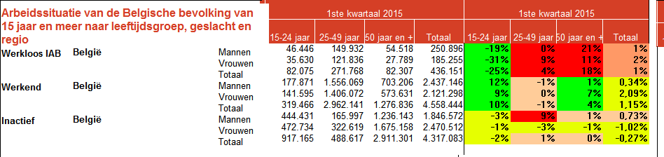 http://statbel.fgov.be/nl/binaries/D...325-265039.xls de jeugdwerkloosheid zakt goed, de midlifers zitten wat op de sukkel en de 50+ zitten volledig uit de markt geprezen dankzij de eeuwige indexering in België souperen die de budgetten op en prijzen ze zichzelf uit de markt... Maar op het vlak van totale tewerkstellingsgraad is het niet slecht te noemen en aantal inactieven is het ook niet slecht te noemen