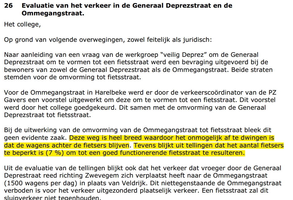 - ik ben niet tegen die eenrichting - ik ben ook niet tegen een fietsstraat - ik ben ook niet tegen een snelheidsbeleid die gebaseerd is op ongevallenreductie maar ik constateer: - dat er geen enkele statistiek bestaat van ongevallen, of dat het antwoord is, je gaat dat toch niet vragen zeker daar heeft de politie zeker 14 dagen werk aan... - dat de snelheid bij de school in theorie alleen maar 30 moet zijn wanneer de kinderen van en naar school gaan. Men gebruikt die school om te gaan beweren dat de V50 overdreven snelheid is... dat is dus niet juist. Die v85 50km/u is perfect voorbeeldig gedrag van de burger, want de scholen zijn niet gans de dag open.. die V85 50km/u illustreert ook dat er niet te snel gereden wordt in die straat. Het is een perceptie, en men werkt gewoon op die perceptie. En die perceptie komt zelfs vreemd genoeg tot stand doordat de straat stilstaat tijdens de schooluren en he tde indruk geeft dat er dan veel volk op tour is... terwijl het gewoon allemaal mama's zijn die met de 'otto' het kindje komen halen 4x per dag je kent dat toch ? bewijs dat het eigenlijk met een dynamisch bord was opgelost http://www.mobielvlaanderen.be/persb...ikel.php?id=73 - verder wordt de oplossing om iedereen een garage te geven niet uitgewerk... Ook daar gaan ze ergens te beperkt geredeneerd. Want die straat is te SMAL. Niet te BREED, te SMAL om 2 parkeerstroken en 2 bussen te laten passeren... Trouwens de ommegangstraat is zelfs te smal voor 2 parkeerstroken en 2 auto's te laten passeren. Is dus nog smaller dan de gen deprezstraat. Dus daarom dat ik ook weet dat die tekst niet klopt. Of ze zitten daar allemaal met een zinsverbijstering - en de ideale oplossing is gewoon de straat die ooit voorzien was om zwevegem/harelbeke te verbinden dan ook effectief te bouwen. Het gaat ove r200m? wegstrook, kost vermoedelijk 1miljoen euro... Nee men zet liever paalkes, drempelkes, lijntjes schilderen, flitspalen van 70K etc.. Volgens mij betalen die flitspalenfabrikant gewoon als de beste de ambtenaren.