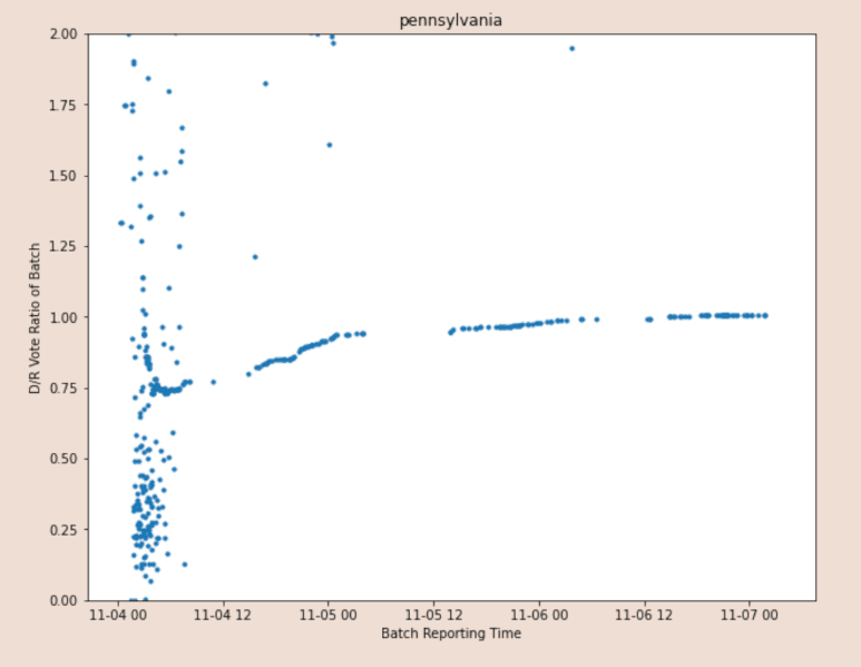 Hoe kan dat nu dat men de stemmen GEORDEND heeft met meer en meer Biden stemmen ? Welke ordening van post-gestuurde ballots kan nu zo een gladde toename verklaren ? Als het is omdat er "verschillende ballots binnenkomen" dan zou men RANDOM sprongen moeten hebben, niet een systematische verhoging he. Welke orde parameter is gebruikt om die ballots te tellen exact in de orde van toenemende Biden stemmen ?? |