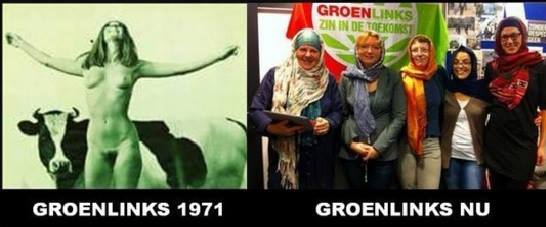 Datzelfde verschil kun je maken in Vlaanderen, met het Agalev van 1979 dat het had over seksuele vrijheid, de naakte vrouw van toen is vervangen door een gesluierde moslima. En dat soort partijen noemt zich porgressief, terwijl ze regelrecht richting onvrijheid gaat!