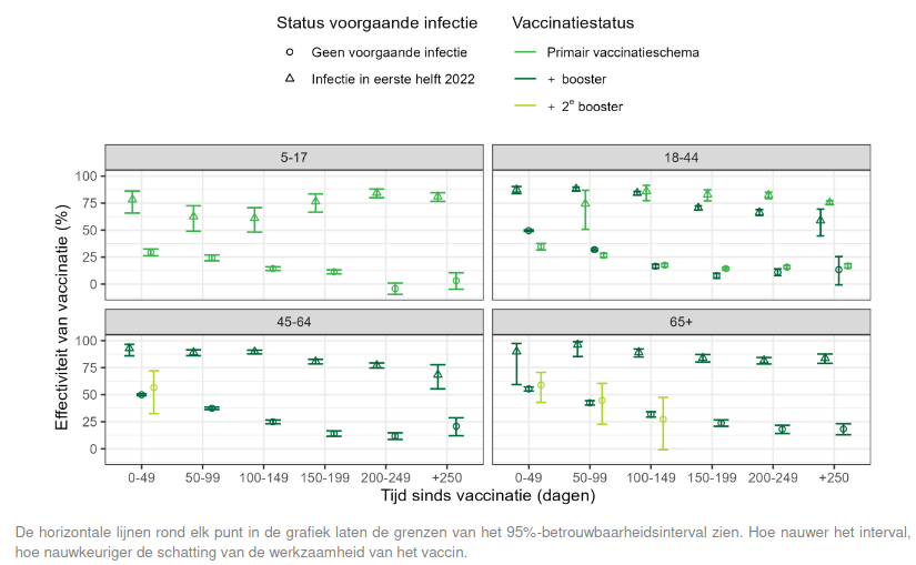 Aan de andere kant, voor omicron is de kans op zware ziekte - zelfs bij ouderen - ook minuscuul. Er zijn papers die zouden vaststellen dat het effect tegen zware ziekte ongeveer een factor 1.5 is. Beter als niks, zal je zeggen. Gene vette, eerlijk gezegd. Bij delta was dat nog een factor 5 tot 10. En helemaal in 't begin, een factor van meer dan 20. Maar nog eens, er zijn bijna geen zwaar zieken meer met omicron ook niet. Dus is het niet erg dat de vaccins bijna niet meer werken. Pas op, ik weet niet wat de NIEUWE vaccins doen. Niemand weet dat eigenlijk, want ze zijn nog niet bestudeerd. Misschien werken die beter. Nu, als je een bevestiging wil zien van die factor 1.5 of zo, dan volstaat het naar de wekelijkse statistieken van sciensano te kijken ook. Kijk naar de meest recente update: https://covid-19.sciensano.be/sites/...e%20update.pdf Pagina 24. Om de vaccin werking te zien moet je natuurlijk kijken naar de dinges "ZONDER EERDERE BESMETTING" he want anders kijken we naar de bescherming door natuurlijke immuniteit, niet vaccinale. Zoals je ziet gaan die allemaal redelijk snel naar beneden de 50% efficientie, en nadien naar heel dicht bij 0. Daarentegen, de bescherming van een natuurlijke infectie blijft redelijk hoog niewaar. Merk op dat bij de minderjarigen, de efficientie nooit hoger dan 25% is gegaan. Het is juist dat voor ziekenhuis opnames, de booster tot 50% efficient is volgens die data. Ik had een publicatie gezien waar het eerder rond de factor 1.5 was, maar goed. Laatst gewijzigd door patrickve : 19 september 2022 om 19:47. |