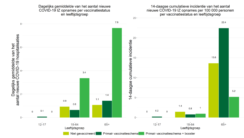 Want als je naar een ouder rapport kijkt, bijvoorbeeld dit: https://covid-19.sciensano.be/sites/...1%20-%20NL.pdf van de eerste helft van juli 2022, dan vinden we bijvoorbeeld, voor ziekenhuis opnames en voor intensieve zorg opnames het volgende. Bij 65+: We zien dat de efficientie van een booster op ziekenhuis opname ongeveer een factor 2 is (dus 50% efficientie) en de efficientie voor IZ opname een factor 3 (dus 66% efficientie). Maar merk op dat de efficientie van gewone vaccinatie (2 spuiten) STERK NEFAST is. Ze hebben dus de negatieve efficientie van de gewone vaccinatie niet eens durven plotten in hun rapport, enkel die van geboosten. |