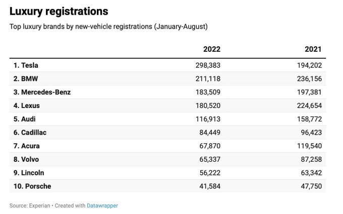 Tesla domineert in 2022 de premium automarkt in thuisland USA, de 2e grootste automarkt na China. In 2021 was Tesla nog 4e zie tabel onderaan.