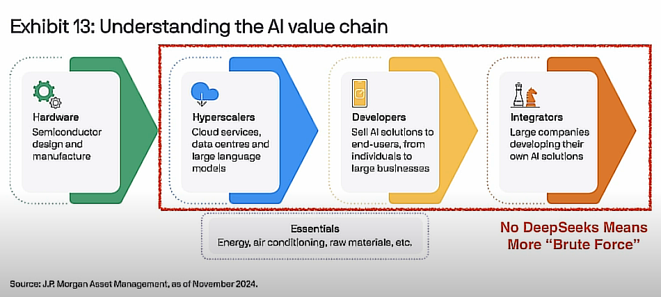 Over Xpeng: https://nl.wikipedia.org/wiki/Xpeng_Motors Volkswagen [dat in zijn thuisland in de problemen zit] heeft er een participatie in genomen. Denk aan de combinatie van de Xpeng met ingebouwde AI van DeepSeek. Voor de ontwikkeling van meer of volledig autonome wagens kan met DeepSeek een goede zaak gedaan worden. Zonder DeepSeek is veel meer "brute kracht" nodig, stelt onderstaande figuur. (fig.)