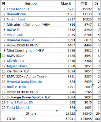 Q1 of eigenlijk maar februari en vooral maart zouden er in die 14 landen bijna 20.000 model 3 verkocht zijn, of de rangschikking Q1 Europa-14: