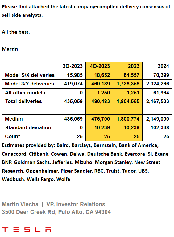 Momenteel > $ 262 en +2,2%. Tesla zal zijn doel van 1,8 miljoen leveringen voor het ganse jaar wel halen. Dan moet het kwartaalcijfer van 476.000 gehaald worden. Ondanks minstens een schip niet op tijd zal leveren (wegens omweg via Zuid-Afrika, 9 dagen verloren) (een oude schatting van 8 december in bijlage) Citaat: