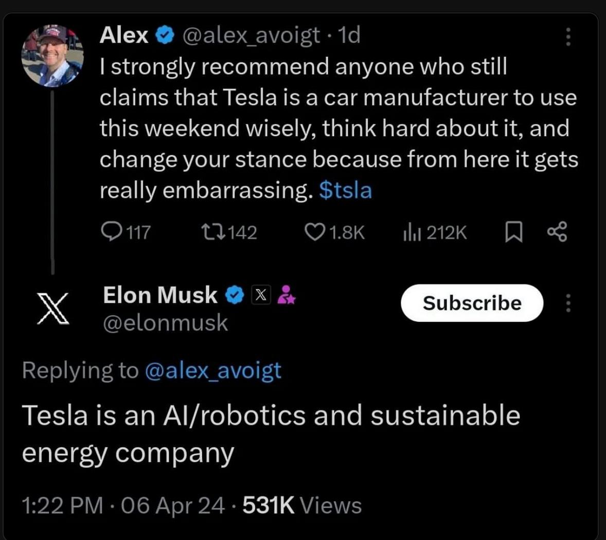 https://newrepublic.com/article/1809...-earnings-call "Musk deflected from his car company’s unraveling by suggesting that Tesla is not, in fact, a car company at all. Tesla, he said, “should be thought of as an AI or robotics company. If you value Tesla as just like an auto company, you just have to—fundamentally, it’s just the wrong framework and it will come to be.”