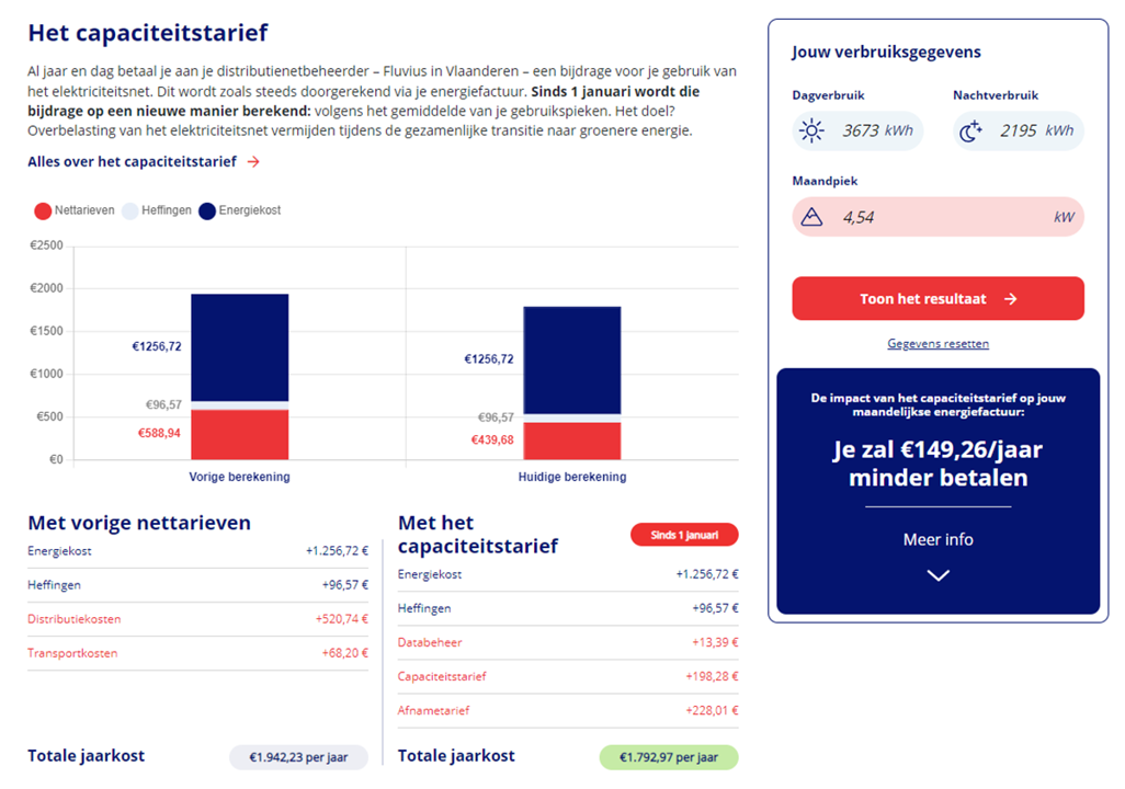 Op mijn.energie kan je perfect simuleren wat het verschil gaat zijn in distributiekost indien je je verbruik kent en het gemiddelde van de maandpieken. Ik heb gegevens voor in totaal 10 maanden (jun 2022 t.e.m. maart 2023), maar ik vermoed dat het jaargemiddelde (4.54 kW) weinig gaat schelen en waarschijnlijk nog wat lager gaat liggen. Mar 5,28 Feb 5,02 Jan 5,06 Dec 5,66 Nov 4,28 Oct 4,37 Sep 4,05 Aug 3,96 Jul 3,80 Jun 3,96 Voor ons huis is de maximumpiek zonder meerkosten vastgelegd op 7.41 kW in dat kwartier, ik weet (nog) niet hoe men dit exact berekent, maar het is in ieder geval gelinkt aan het aantal gedomicilieerden (5) dat in het huis woonachtig is. In de simuliatie kan je zien dat de historische nettarieven in totaal € 588.94 kostten: - Distributiekosten € 520,74 - Transportkosten € 68,20 Vanaf 1 januari wordt dit in 3 onderdelen gesplitst,wat bij een gelijkaardig verbruik zou dit betekenen dat deze kost zakt naar € 439.68: - Databeheer € 13,39 - Capaciteitstarief € 198,28 - Afnametarief € 228,01 Dat maakt € 149.28 vermindering van de kost omdat de pieken (heel) laag liggen. We doen daar niet specifiek veel voor, het komt vooral door ons dubbel warmtepompsysteem waardoor onze warmtepomp voor de (vloer-)verwarming slechts een dikke 6 maand draait en nooit boven de 35°C moet verwarmen terwijl wanneer dezelfde warmtepomp ook zou gebruikt worden voor sanitair water, deze regelmatig tot pakweg 55°C of 60°C zou moeten gaan en onze warmtepomp voor sanitair water een warmtewisselaar op 50°C houdt, da's zoals een batterij opladen, wat ook sterk piekvermogens elimineert. Ook het feit dat we geen frituur hebben speelt een rol want dat is één van de megaverbruikers op korte tijd in de keuken. De visualisering van de simulatie: