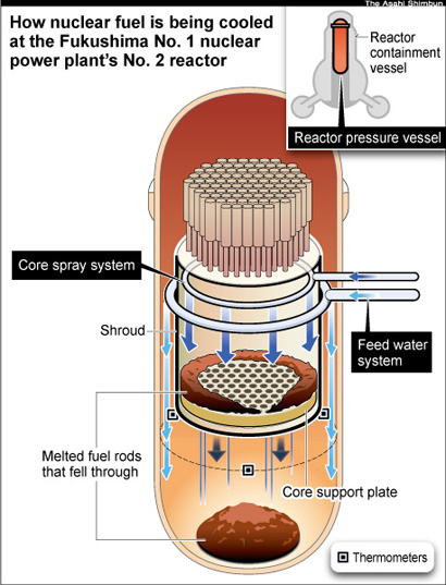 http://www.smh.com.au/world/first-gl...120-1qaap.html http://www.japantimes.co.jp/news/201...nside-reactor/ als uw engels goed genoeg is dan begrijp je dat reactor 1-2-3 allemaal gesmolten zijn dat de radiactiviteit daar gewoon op de grond ligt van vessel 1 (druk vat) dat vessel 2 (het opvang vat) die daarrond zit bij reactor 2 dik aan het roesten is, dat het water daar maar 60cm hoog staat ipv 10meter dus dat is slecht er zit daar een scheur ergens of een lek die ze zoeken dat de temperatuur stabiel op 50° staat dus de reactie ligt stil dat er geen scheuren zitten in vessel 1 dus de radioactiviteit zit allemaal opgesloten in vessel 1, die uraniummassa ligt daar gesmolten op het vat en blijft daar nog een beetje nagloeien. De radioactiviteit is heel hoog 70sievert, en de bestaande apparatuur zoals inspectiecamera's overleven dat geen 2 dagen in zo'n omgeving. Als je daar een tekeningske van wilt, dus dat blauw is vessel 1 (drukvat), en die staven liggen daar gesmolten in vessel 1, zal nog een vies werkske zijn om dat op te kuisen als je een foto wilt vanonderaan vessel 2 of het opvangvat, dan hebje deze foto ![]()