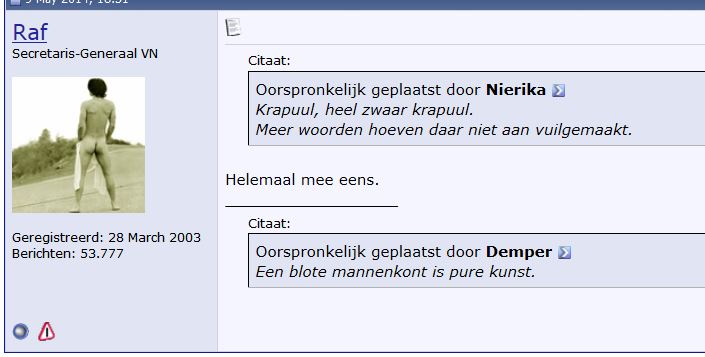 Nooit begrepen waarom mensen hier zogezegd komen discussiëren om zich vervolgens onmogelijk te maken bij hun discussiepartners. Van trollen wel. Ik heb er nu 12 zo. Normaal vallen daar regelmatig permbans uit. Laatst gewijzigd door eno2 : 16 juni 2015 om 15:53. |