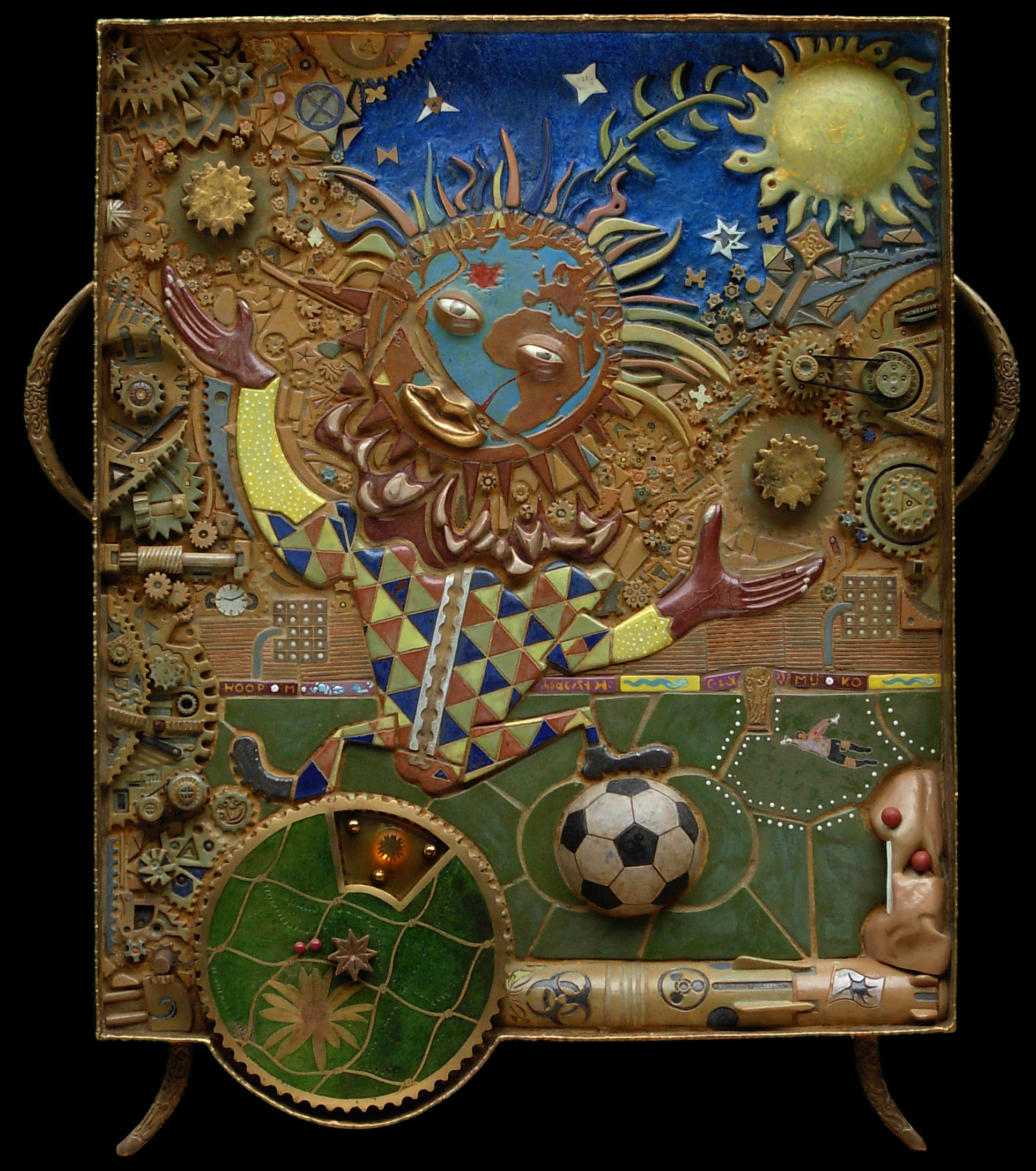 Honderden 'werken' in bijna evenveel stijlen. Het wordt moeilijk een idee te geven van een Oeuvre met een paar fotos. Ik zip een werk mee dat de destructie van mijn huis eerder dit jaar overleefde. Ik dacht het op mijn website te zetten maar dat project ligt stil voorlopig. Het werk heet 'Voetbalharlekijn'. Ik begon het tijdens het voetbalwereldkampioenschap in Duitsland. Het bevat de tekst "Ter/in herinnering aan de doden door oorlog tijdens de periode van het wereldkampioenschap voetbal in duitsland MMVI" (Dronedoden dacht ik aan o.a.). Onderdeel van het werk is een 'rad der fortuin' (zie flashvideo die je kan stilzetten op de verschillende symbolen), verlichting met licthknop in voetbal verwerkt (video), en een 'geheim' vakje (typisch voor een bepaalde periode van mijn werk). Voetbalharlekijn is voornamelijk gemaakt uit geglazuurd aardewerk. Het is ongeveer 1 meter hoog. Aan de achterkant bevindt zich een 'prijskaartje' (zie foto).