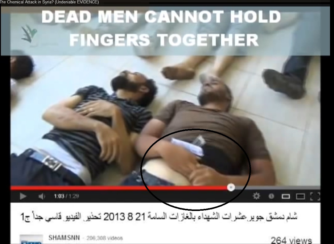 Is de man rechts vredig ingeslapen met zijn rechter hand in de linker en is zijn lichaam zo vervoerd naar het mortuarium en daar op de grond gelegd? Wie gelooft dat nou? Als er werkelijk 1492 doden zijn als gevolg van een gifaanval, dan is het niet nodig om een video te maken waarop enkele mannen / rebellen figureren als doden. De conclusie moet zijn dat Assad geen aanval met gifgas heeft laten uitvoeren. Dat moeten Obama en Kerry ook kunnen zien. Omdat ze volhouden dat Assad het leger een gifaanval heeft laten uitvoeren concludeer ik dat deze heren in een complot zitten met de rebellen. Het argument om Assad te lijf te gaan is Obama uit handen geslagen en uit nood stelt hij nu eisen omtrent de vernietiging van chemische wapens aan Assad. Over de kernwapens in het Midden-Oosten hoor je hem niet, want die dienen de vrede. De Nobelprijswinnaar voor de vrede heeft zijn ware gezicht getoond. De VS heeft voor de zoveelste keer bewezen dat ze geen middelen schuwt om haar smerige zaakjes te doen slagen. Leugen en bedrog is haar handelsmerk en haar personeel bestaat uit rovers, moordenaars en verkrachters. Het kan niet anders of de bedoelingen van de VS zijn misdadig. Het is vreselijk om dat te moeten vaststellen, want de EU is met handen en voeten aan de VS gebonden. Die banden moeten worden verbroken indien de EU nog humane doelstellingen wil nastreven en indien de VS zich niet bevrijdt van haar misdadige regime. |
