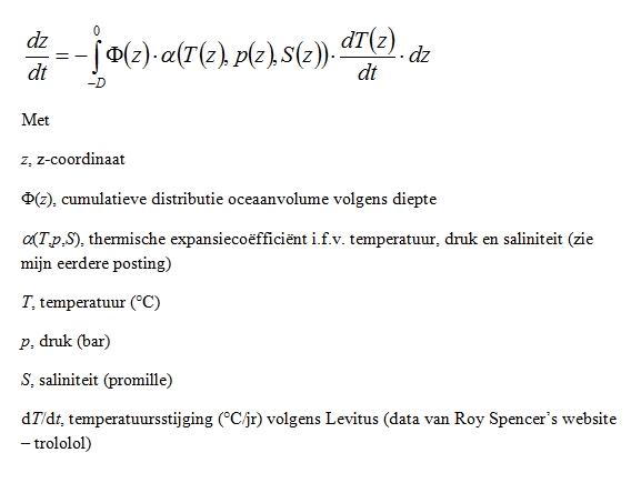 Anyway, als ik me toch moet bewijzen - ik heb de berekening eens snel gemaakt. Dit maal wel rekening houdende met de temperatuurs-, druk- en saliniteitsafhankelijkheid van de expansie van zeewater en rekening houdende met de T-verdeling volgens diepte en de opgemeten T-stijging volgens diepte (op basis van gegevens van de website van uw immer teerbeminde Roy Spencer), Snel integreren, met een discretisatie van delta_z = 350 m, geeft een zeespiegelstijging ten gevolge van thermische expansie van 0.65 mm/jr - hetgeen perfect ligt tussen de geobserveerde stijging (tgv. thermische expansie) tussen de 0.37 en 1.6 mm/jr van de afgelopen 2 decennia, opgemeten aan de hand van het Argo meetnet (Cazenave et al., 2008). De totale zeespiegelstijging, inclusief afsmelten van landijs en zee-ijs bedroeg tussen de 2.5 en 3.1 mm/jr. Nu content ? |