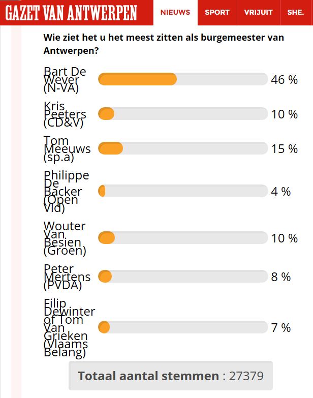 In antwerpen heb je het bijkomende fenomeen dat de Lijst Dewinter er quasi zeker een hoog resultaat haalt. Verloren stemmen dus, maar dat maakt er de 2 andere coalitiebesprekingen (links als alternatief, rechts veeel waarschijnlijker) des te spannender op. Laat de tsjeven dan nog excelleren in de kunst van het verraad en graag messen in de rug steken en we hebben alle elementen om in 2018 een schitterend drama te verwachten. |