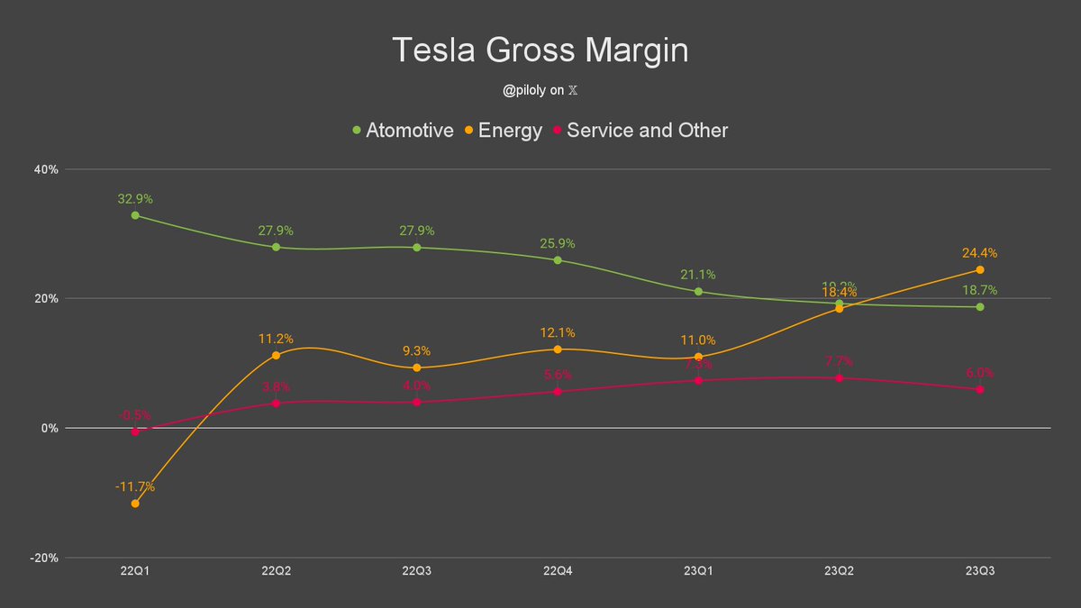 Voor een zware Cybertruck met matige aerodynamica is dat zeker nodig. De Cybertruckfans zijn natuurlijk ontgoocheld dat de production hell van performante 4680 cellen en de Cybertruck zo lang duurde. En die flessehals van beide zal zeker nog tot 2025 duren. De ene kan niet zonder de andere. En de Semi, een zware vrachtwagen, heeft die 4680 ook nodig... -- - - Is er ook nog positief nieuws? Eigenlijk is het te vermelden waard dat Tesla nu significant meer winst. maakt met hun megapacks voor batterijparken. Daar worden wel duurzame zware LFP-batterijcellen voor gebruikt. Bij batterijparken speelt gewicht weinig rol. Waar de gros margins in de automotive gedaald zijn, dit wordt maar lichtjes gecompenseerd door de stijgende margins bij energy (storage) Citaat: