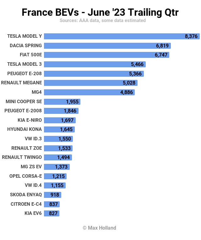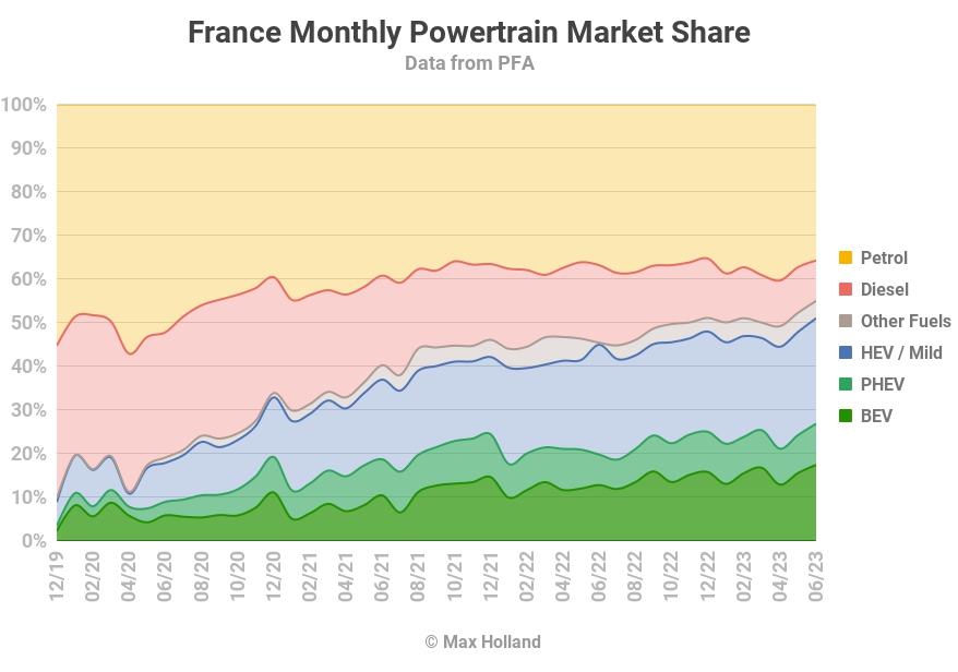 De Franse electrische wagens verkopen helemaal niet zo slecht. Verkoop nieuwe BEV toch langzaam maar zeker op weg naar 20% marktaandeel in Frankrijk. De dieselwagens die meer dan 3 straten ver geraken zakken naar 9,3% marktaandeel. https://cleantechnica.com/2023/07/03...-y-bestseller/ France saw a new EV record high of 26.9% market share in June, up from 19.8% year on year. Full electrics grew from 12.8% to 17.4% share, while plugin hybrids grew from 7.0% to 9.4%. Overall auto volume was 190,847 units, up some 12% YoY, though still below long term norms, and with almost all the growth coming from plugins. The bestselling BEV in June was again the Tesla Model Y, just ahead of its sibling, the Tesla Model 3.