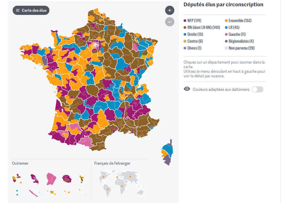 De 'extreem rechtse' RN verdubbelde haar zetels en behaalde een overwinningsnederlaag. Het centrum hielp 'extreem links' aan een behoorlijk aantal zetels. Waarom verkiest men 'extreem links' boven 'extreem rechts' gezien de eerste zonder oorlog veel meer doden heeft veroorzaakt dan de tweede ? Omdat 'extreem links' de culturele macht heeft, de macht in de bovenbouw, en omdat het de rijken beter uitkomt, de neerwaartse druk op de lonen, de stijgende prijzen van het vastgoed, de polarisering en stijgende ongelijkheid, ... 'links' mag fier zijn op haar overwinning, ze veroorzaakt wat ze zegt te willen bestrijden ... de bende historistische ideologische mongolen zal niets kunnen verhelpen aan de problemen die ze verergert met het op een kier houden van de grenzen die vooral de rijken ten goede komt. De neerwaartse spiraal wordt niet gebroken. Ach ja, nu zullen de 'vredelievende' 'linksen' en 'kansenparels' Frankrijk tenminste niet volledig in brand zetten en plunderen. Toch één positieve noot. Ftw! Op democratische verandering hoeven we niet meer te hopen.