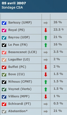 Inderdaad. Ik zie ook niet Le Pen de twede ronde dit keer halen. Volgens mij zal alles tussen de drie anderen (Sarkozy, Royal en Bayrou) spelen voor de twede ronde. De peilingen geven hen al meer dan 20%. In de realiteit denk ik dat het tussen Sarkozy en Royal zal spelen en dat het verschil in procent miniem tussen de twee zal zijn.