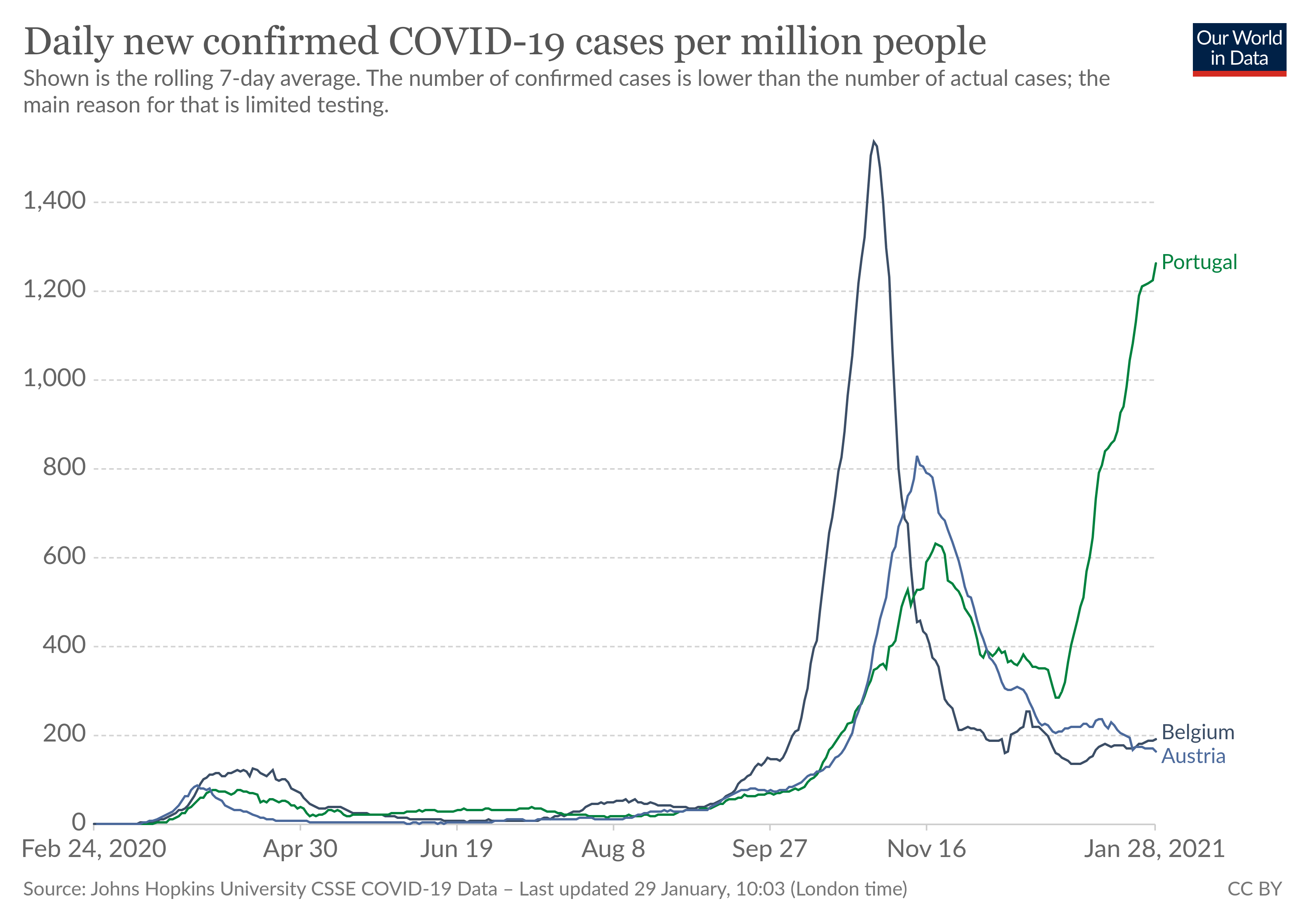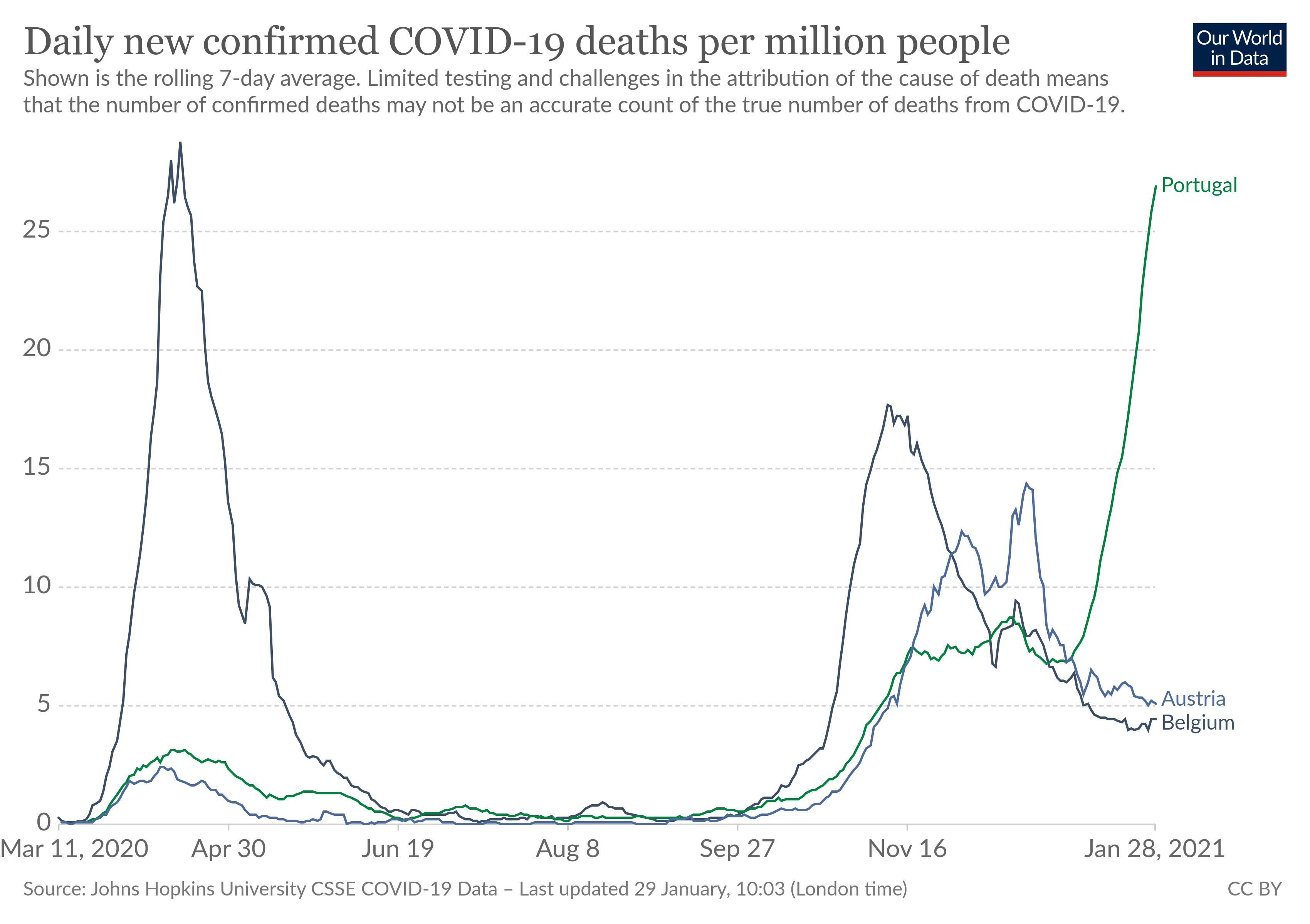 Zoals je ziet is Portugal nog maar pas begonnen aan zijn cases die stijgen, en dat heeft nog niet eens "Belgische" niveaus gehaald, maar het aantal doden per dag zit al veel hoger dan Belgie haalde in november. Laatst gewijzigd door patrickve : 30 januari 2021 om 09:48. |