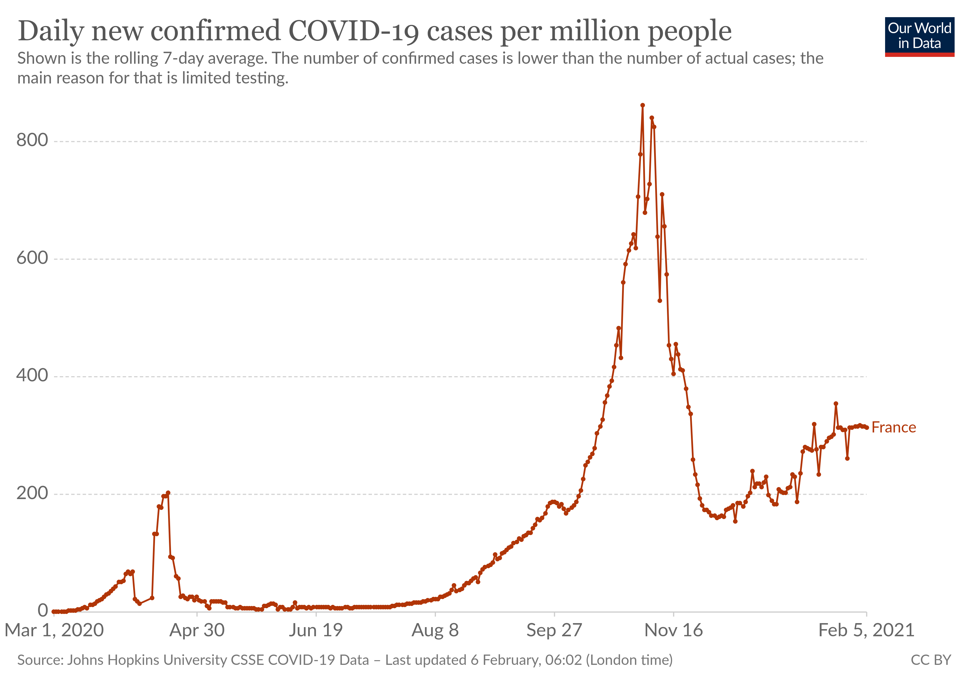 ![]() Ik vind de gelijkenis van de Franse curve van gevallen toch wel vrij gelijklopend met een simpel SIR modelletje waarbij men net iets te vroeg een lockdown heeft ingevoerd....
