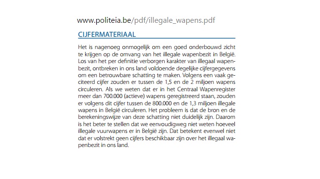 Tussen de 800.000 en 1.300.000 illegale vuurwapens in België. Elke 'zot' kan wel op één of andere manier aan een vuurwapen geraken. Als het je interesseert om juiste informatie neer te schrijven kan je de link eens helemaal doorlezen. Een 'eye opener' zou ik zo zeggen. Ik zou stellen dat we met een beter politieapparaat zitten en dat onze samenleving (voorlopig) minder 'zotten' kweekt. Zou dat niet dichter bij de realiteit zitten? |