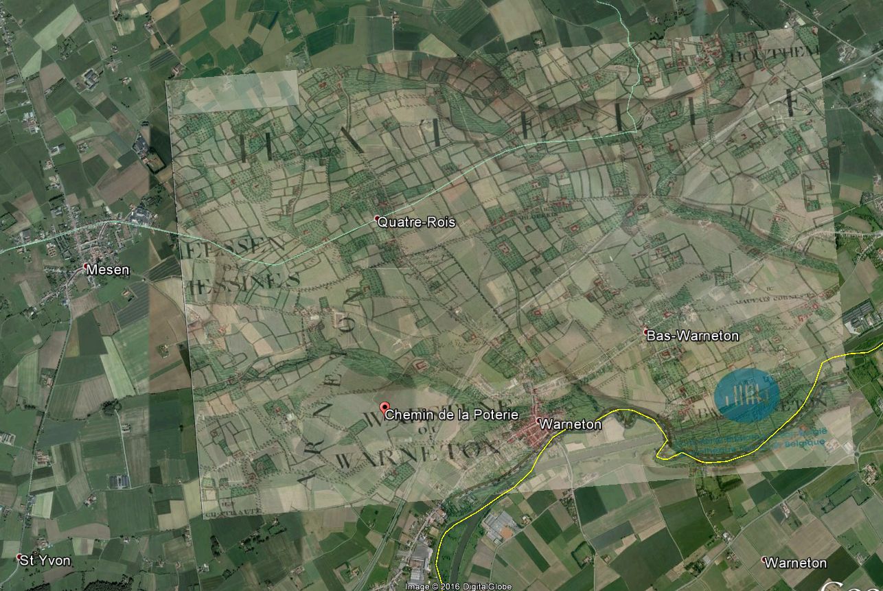 Hier is het toeval dat Pottelberghe/de la Potterie alhoewel ze gelijkend/verfranst klinken niets met mekaar te maken hebben. Een interessante bron voor het speuren naar oude plaatsaanduidingen, de ligging van huizen/hoeves/gronden en tracees van wegen is de Ferraris kaart, gemaakt rond 1770. http://www.kbr.be/collections/cart_p...rraris_nl.html Ik heb er me eens mee geamuseerd de Ferrariskaart te projecteren over Google Earth om te kijken of er in de buurt van de Chemin de la Poterie iets te vonden was. Geen specifieke verwijzigingen of namen gezien. :0( Klik voor 1:1 |
