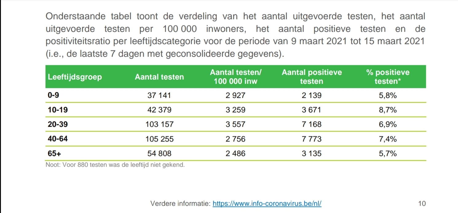 - kinderen 0-9 jaar: op 22 februari 6,0 %, 21 maart 5,7% - jeugd 10-19 jaar: van 10,5% een maand geleden naar 9,3% vandaag - 20-39 jaar: 6,2% een maand geleden, 7,7% nu. - 40-64 jaar: 6,9% een maand geleden, 8,2% nu. - 65-plus: 5,7% een maand geleden, 6,6% nu. Conclusie: vooral de cijfers bij kinderen stijgen sterk... |