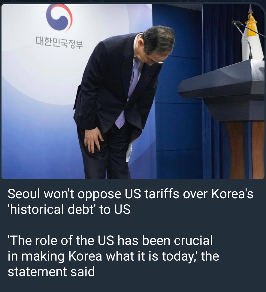 Europa kan misschien een voorbeeld nemen aan Zuid Korea en buigen voor de wensen van het imperium. Tenslotte heeft ook Europa een eeuwigdurende schuld ten opzichte van de VS voor de bevrijding van de Nazis. Zonder post WO2 bezetting van Europa door de VS zouden die gemakkelijk kunnen herleven. Dus buigen en slikken vazalletjes. Gedraag u zoals u aangeleerd werd. De tienden voor de keizer werden enkel wat verhoogd. Niet klagen. Betalen.