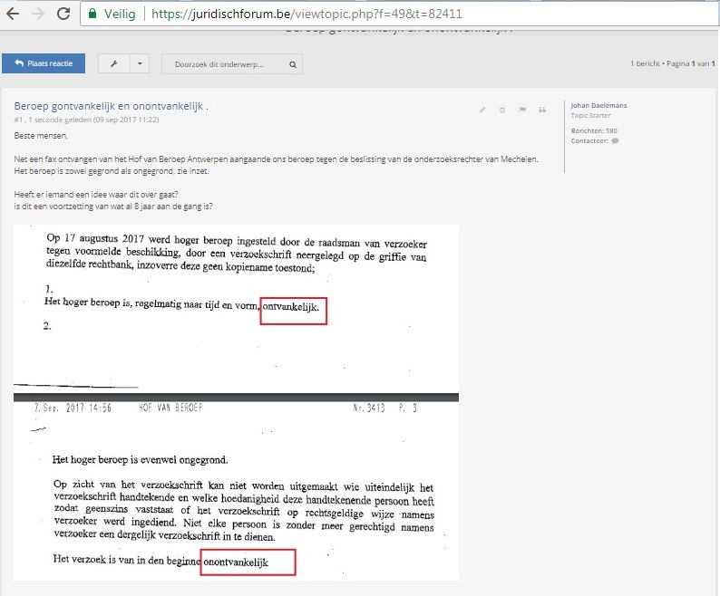 Blijkbaar oordeelt het Hof van beroep dat de vraag om inzage bij de onderzoeksrechter ZELF onontvankelijk is. Blijkbaar heeft de onderzoeksrechter ons ONTERECHT inzage gegeven in het dossier. De reden is in de fax niet zo direct duidelijk, ik weet alleen dat we opnieuw vertrokken zijn voor extra procedures en onkosten waar onze overheid toch lekker 21% BTW van mee graait en zichzelf uit de wind heeft gezet om niet te hoeven opdraaien voor die extra kosten. Mooi... Ik begin toch stillekes te overwegen om dit hele dossier met alle documenten ( wettelijk EN onwettelijk mij ter beschikking gesteld) op het internet te gooien. Dit wordt echt te schandalig voor woorden - 8 jaar miserie op basis van 'onkunde' van enkele ambtenaren. Je moet het maar tegenkomen. Laatst gewijzigd door Johan Daelemans : 9 september 2017 om 11:11. |