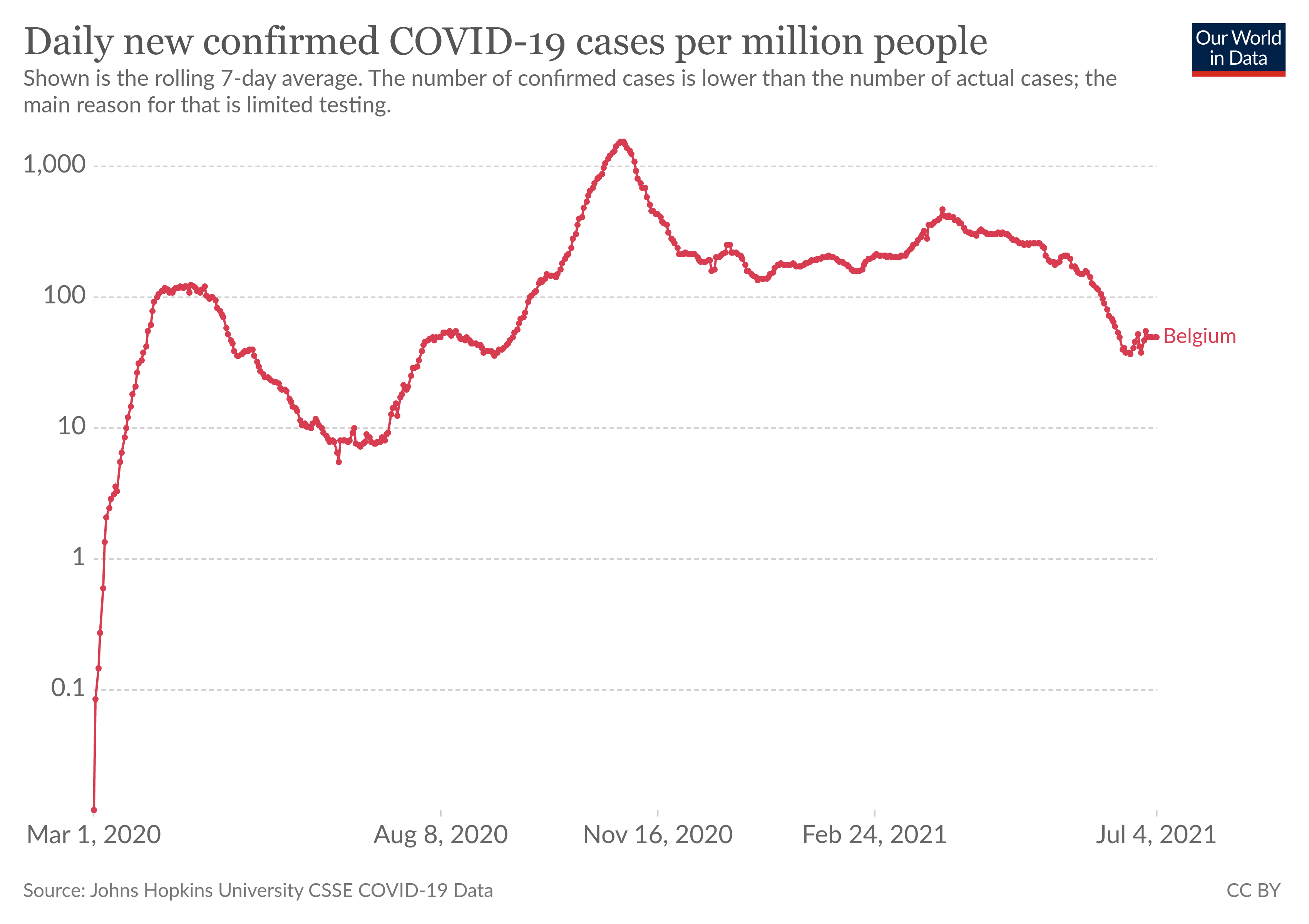 4 juli 2020: 7.75 besmettingen per dag per 1 miljoen inwoners... we hebben het virus bij het nekvel, nog even doorbijten.... 4 juli 2021: 49.7 besmettingen per dag per 1 miljoen inwoners... Want er zijn nu vaccins. |