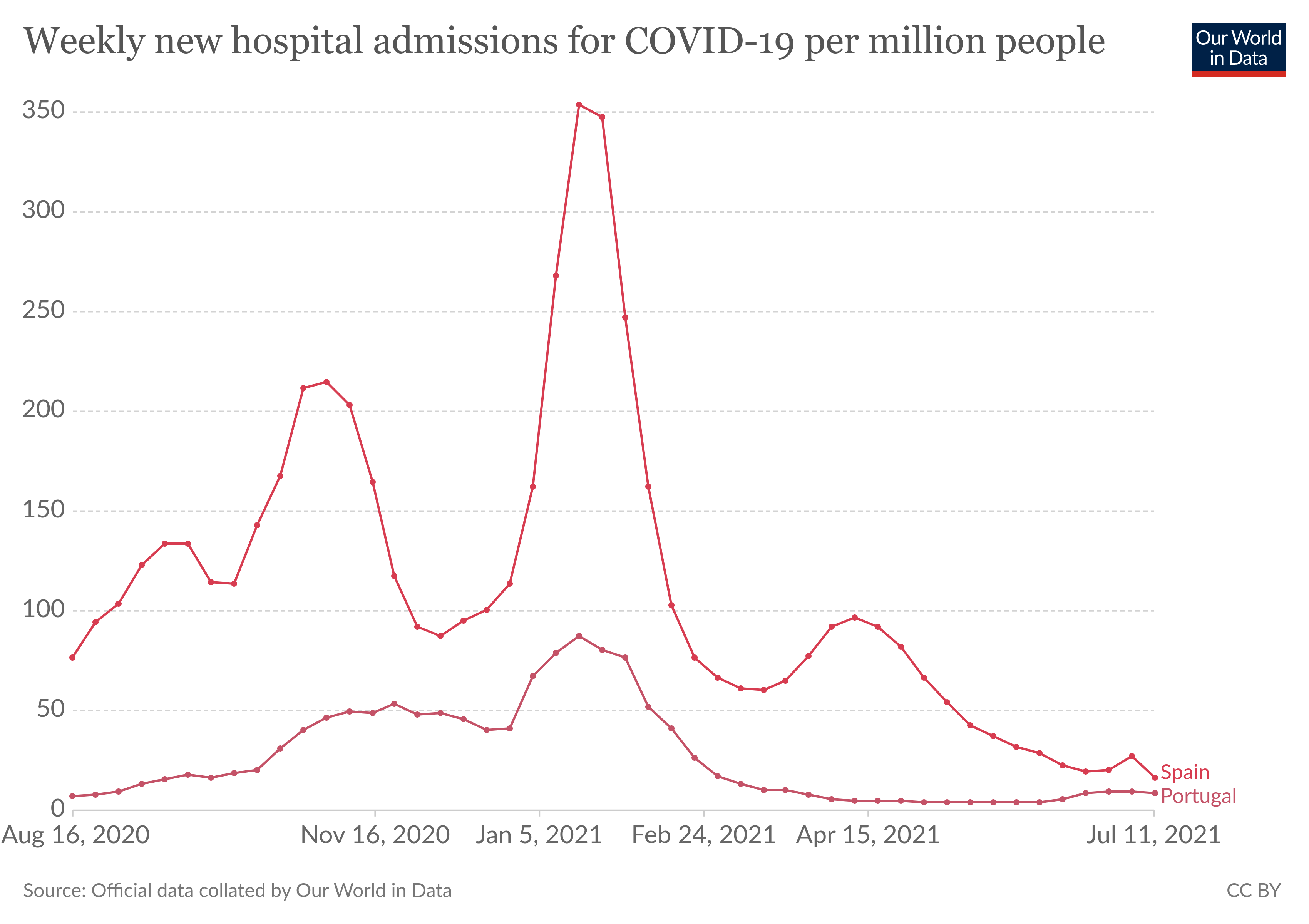 Vergelijkbaar voor Spanje en Portugal. (intensive care opnames enkel voor Spanje beschikbaar)