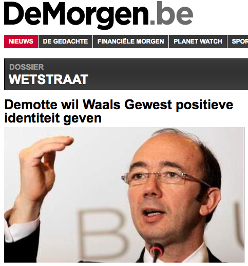 Demotte wil Waals Gewest positieve identiteit geven | De Morgen 01 03 2010 Waals minister-president Rudy Demotte wil het Waals gewest, dat zijn dertigste verjaardag viert, omdopen tot 'Wallonië' en het weer een positieve identiteit geven. Dat berichten de kranten van de groep Sud Presse vandaag. Lees het volledige artikel : http://www.demorgen.be/dm/nl/5036/We...it-geven.dhtml Lees ook : De Standaard : Demotte wil Waals Gewest positieve identiteit geven http://www.standaard.be/artikel/deta...MF20100301_028 La Meuse : "Identité wallonne": donnez-nous vos idées, et aidez Rudy Demotte http://www.lameuse.be/actualite/belg...e-764226.shtml La Dernière Heure: La Région wallonne a 30 ans, Demotte veut lui donner une identité positive http://www.dhnet.be/infos/belgique/a...-positive.html Le Soir : Demotte veut booster l'« identité » wallonne http://www.lesoir.eu/actualite/belgi...e-756183.shtml L'Echo : Demotte veut rebaptiser la Région wallonne et lui donner une devise http://www.lecho.be/actualite/belgiq...303442-589.art |