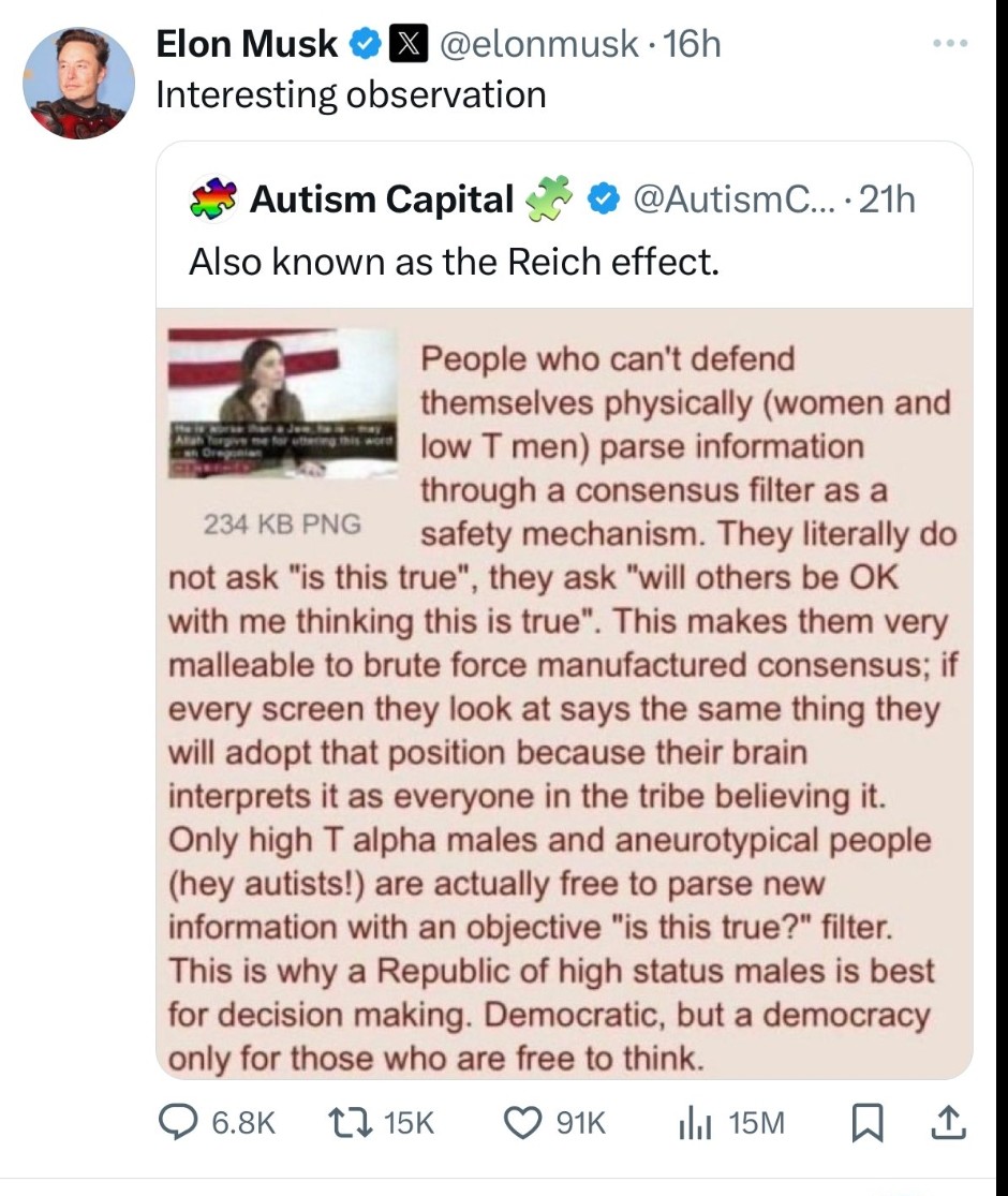 Dat was al de derde keer die maand dat iemand in The Guardian opriep om Musk te arresteren: You know who else should be on trial for the UK’s far-right riots? Elon Musk As an ex-Twitter boss, I have a way to grab Elon Musk’s attention. If he keeps stirring unrest, get an arrest warrant Wat aantoont hoe die gazet optreedt als autoritair propagandakanaal voor "Two-Tier Keir". |