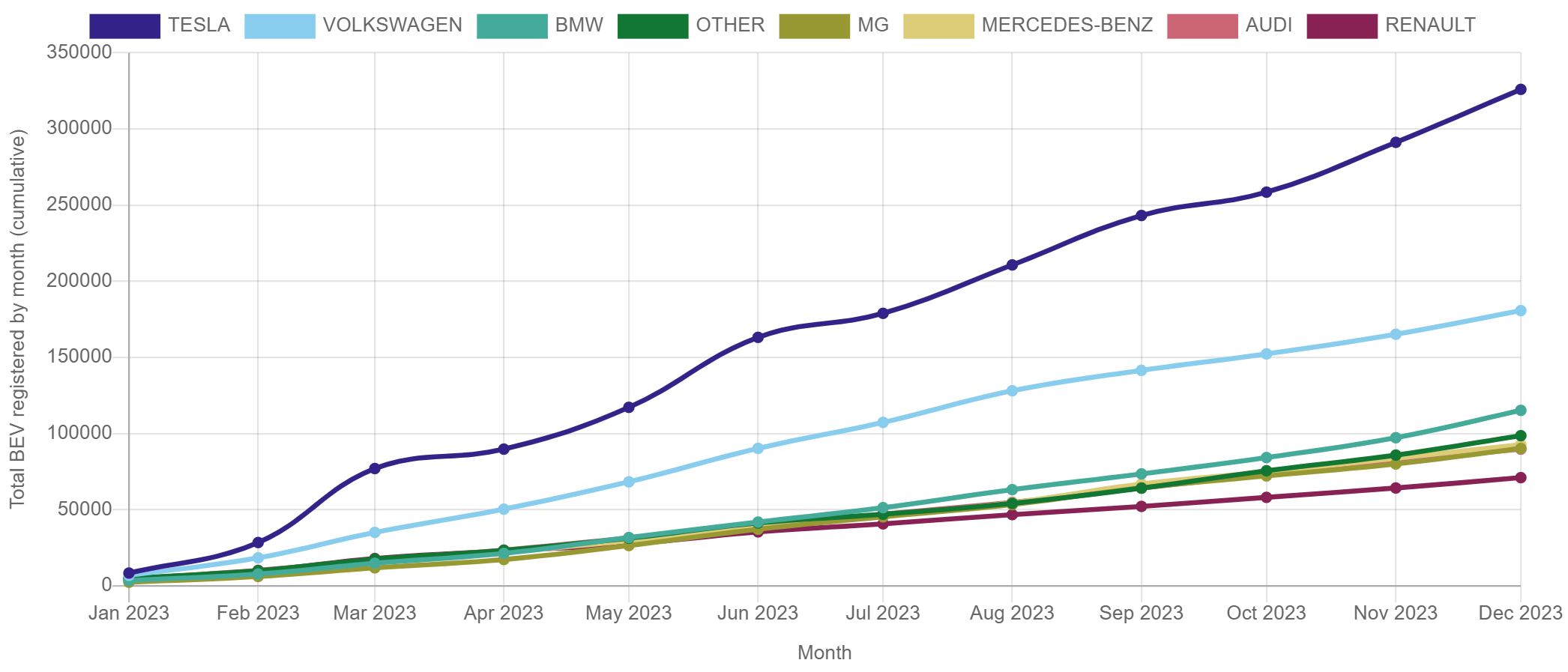 Best sellers for FY2023 (showing top 8), cumulative registrations by months. Countries: FI ES DK GB IT NL SE CH PT BE DE FR NO AT IE