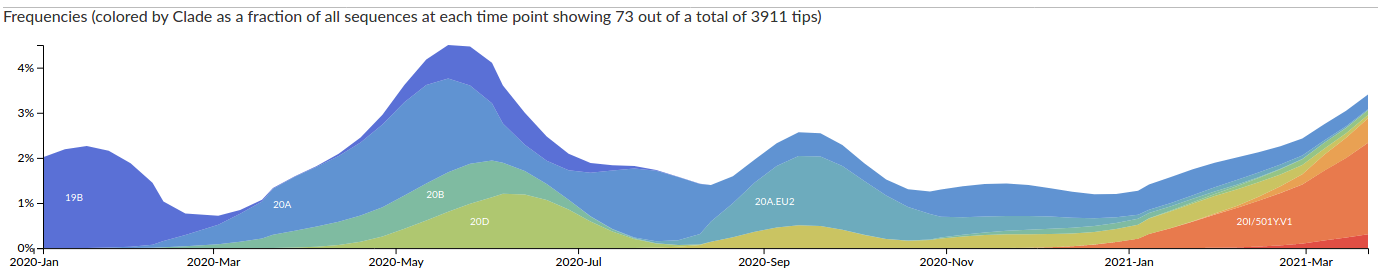 Het is niet echt representatief want te weinig gesequenced en niet uniform, maar als we de clades vergelijken tussen Czechie en Belgie, vinden we dat Czechie inderdaad veel vroeger de volle pot van de Britse variant heeft gehad (de donker oranje band). Daarentegen wij hebben tevens een goed deeltje Z-A (de bleek oranje) en Braziliaanse (rode band) mee.