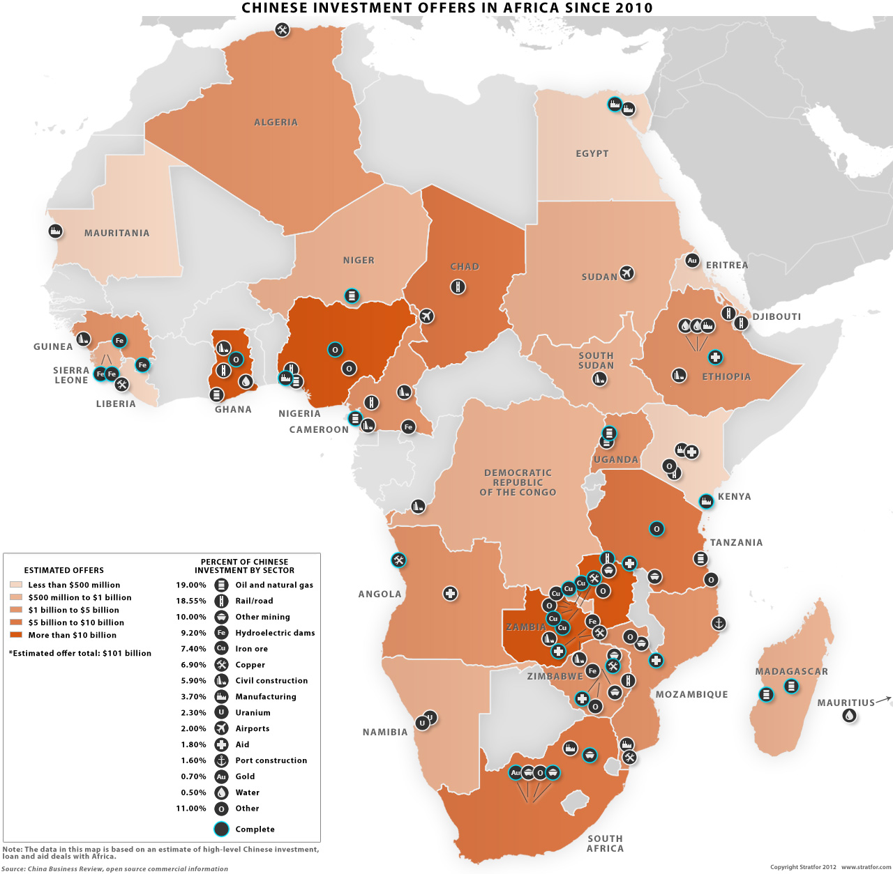 ![]() Figuur: Chinese investeringen in Afrika sinds 2010, totaal = 101 miljard.