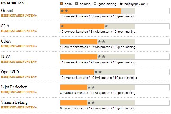 1. Open VLD (5) 2. Lijst Dedecker (6) 3. N-VA (4) 4. CD&V (2) 5. Sp.a (3) 6. Vlaams Belang (7) 7. Groen! (1) Wel erg veel vragen over belastingen en economie. Nauwelijks iets over buitenlands beleid en justitie. |