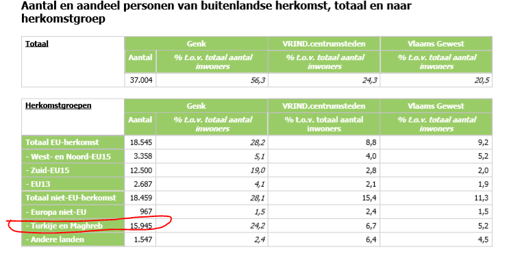 https://forum.politics.be/attachment...1&d=1584902147 Alleen Genk had in 2018 bijna 16.000 allochtonen van Turkse en Marokkaanse afkomst. Alleen iemand die niet kan lezen wat er staat maakt daar met Turkse nationaliteit van. Citaat: